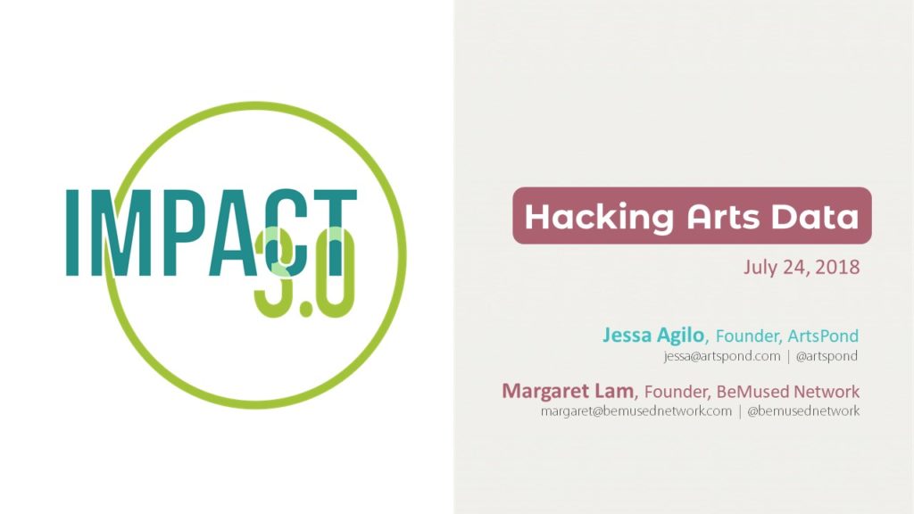This week ArtsPond founder Jessa Agilo was delighted to present an English-language webinar on hacking data in Canadian arts & culture with our valued colleague and partner Margaret Lam of BeMused Network. The hour-long presentation provided an overview of the proposed vision for Artse United, an open source, open data platform cooperative alternative providing arts management and impact analytics tools for small creators and producers across all disciplines. Visit our videos page, or YouTube, for a recording of the full webinar. You can also download the presentation as a PDF.