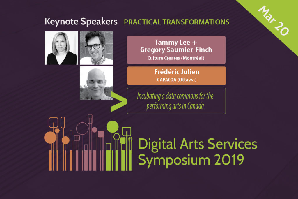 We are happy to share that keynote speakers Frédéric Julien, Tammy Lee + Gregory Saumier-Finch will join forces on March 20 at Digital Arts Services Symposium 2019 to share practical transformations that CAPACOA, Culture Creates, RIDEAU and other others are pursuing to incubate an open, linked data commons in the performing arts.
