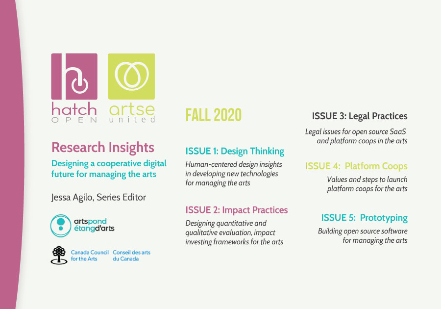 Based on activities and knowledge gathered through the early stage design of Hatch Open (open source arts management software) and Artse United (platform cooperative for the arts), “Research Insights” features five separate but interrelated reports in English and French:
