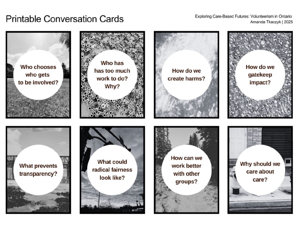 Throughout this collection, I’ve shared visuals, poetry, and provocative questions. I wanted to extend the project to include an audio component.I curated four personas and fictional narratives about what could happen if we do not adopt care-based approaches to volunteerism. This is a small sample of ideas and possible outcomes meant to facilitate dialogue and inspire real action for care-based approaches in volunteerism.